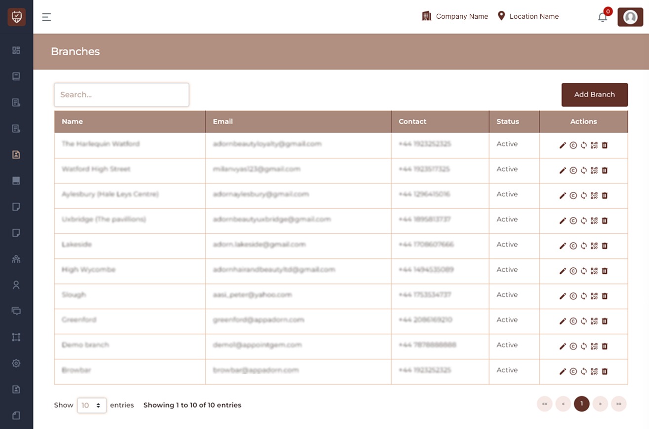 Action Icons : Each branch row contains action icons that allow administrators to manage branch settings.
