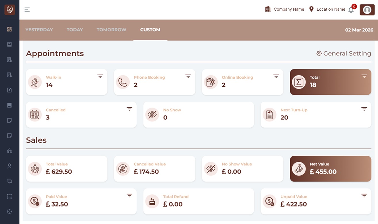 The Dashboard gives you a real-time snapshot of your business performance for the selected branch and date. It helps you quickly monitor appointments, revenue, cancellations, and payment status — all in one place.