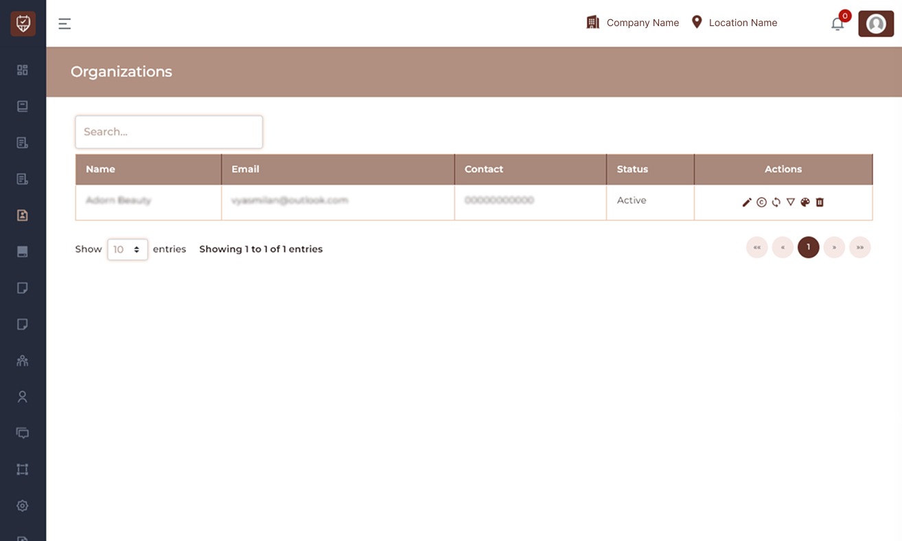 Action Icons : Each organization row contains action icons that allow administrators to manage the account.